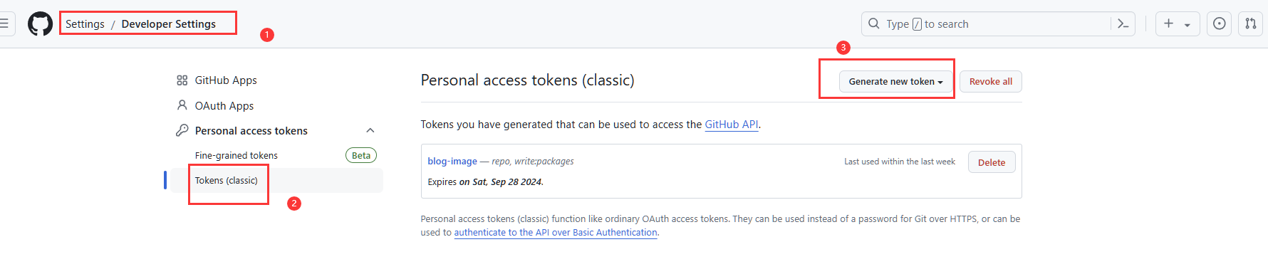 生成一个自己 github 账号的 token 令牌,点击右上角头像->Settings->左侧底部 Developer settings->Personal Access tokens->tokens->Generate New Token,后续需要用到(已有的请忽略)。token 秘钥只显示一次,请妥善保存。